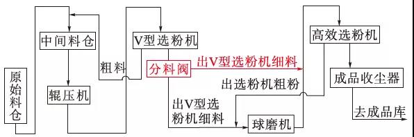 2 粉磨流程改進我們在出V型選粉機與入磨溜子之間安裝可調節翻板式分料閥(以下簡稱分料閥),該分料閥可將物料分為兩路,一路入磨機,另一路經空氣輸送斜槽入高效選粉機,同時,該分料閥還可進行10格調節(0%~100%)。試驗前后工藝流程簡圖及照片分別見圖1~圖3。
